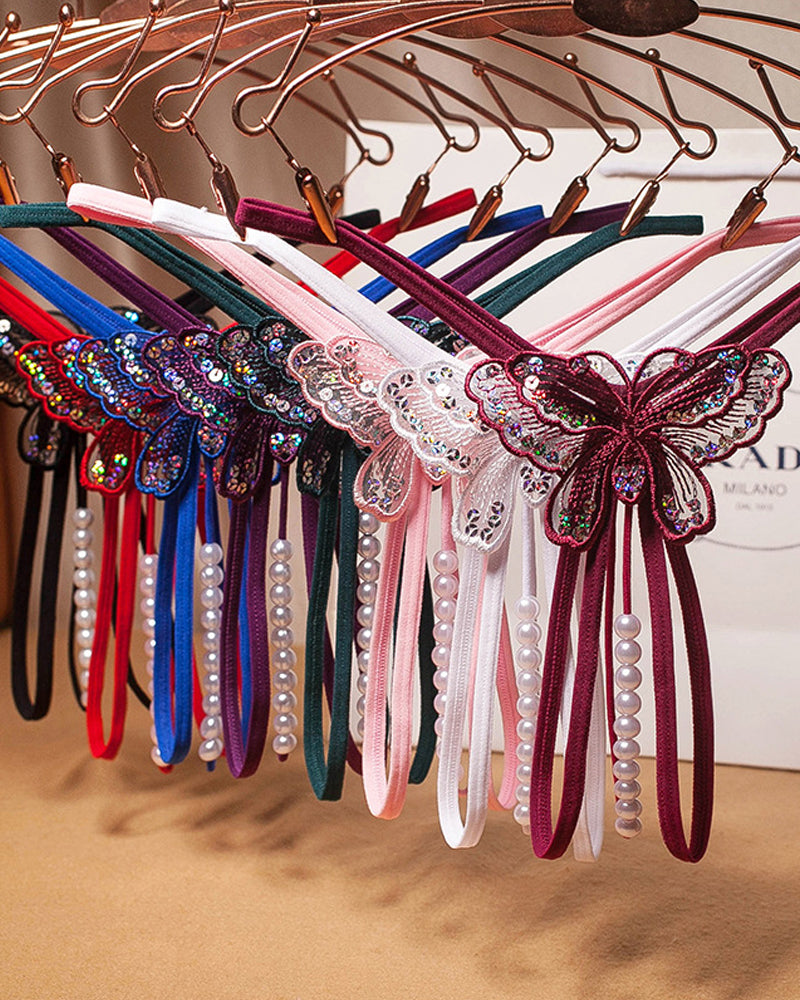 Sexy Sequin Butterfly Embroidered Open Crotch Massage Pearl Thong