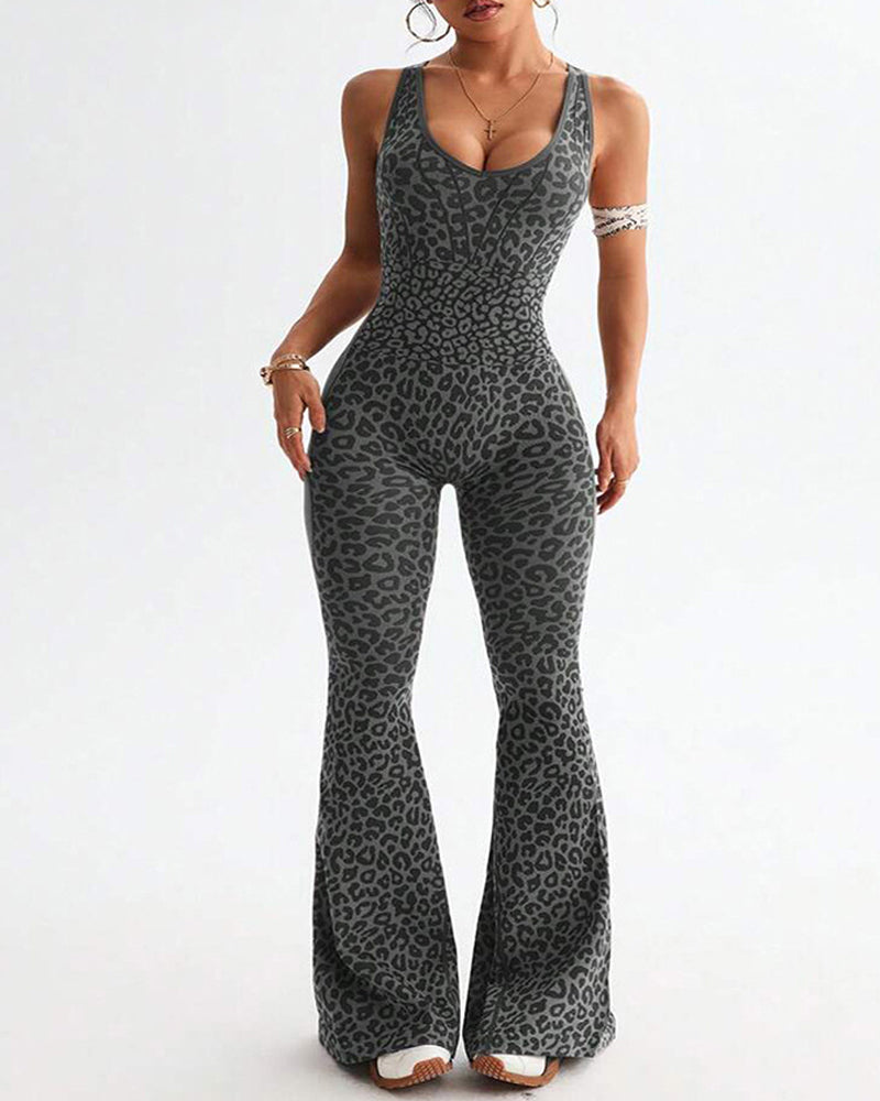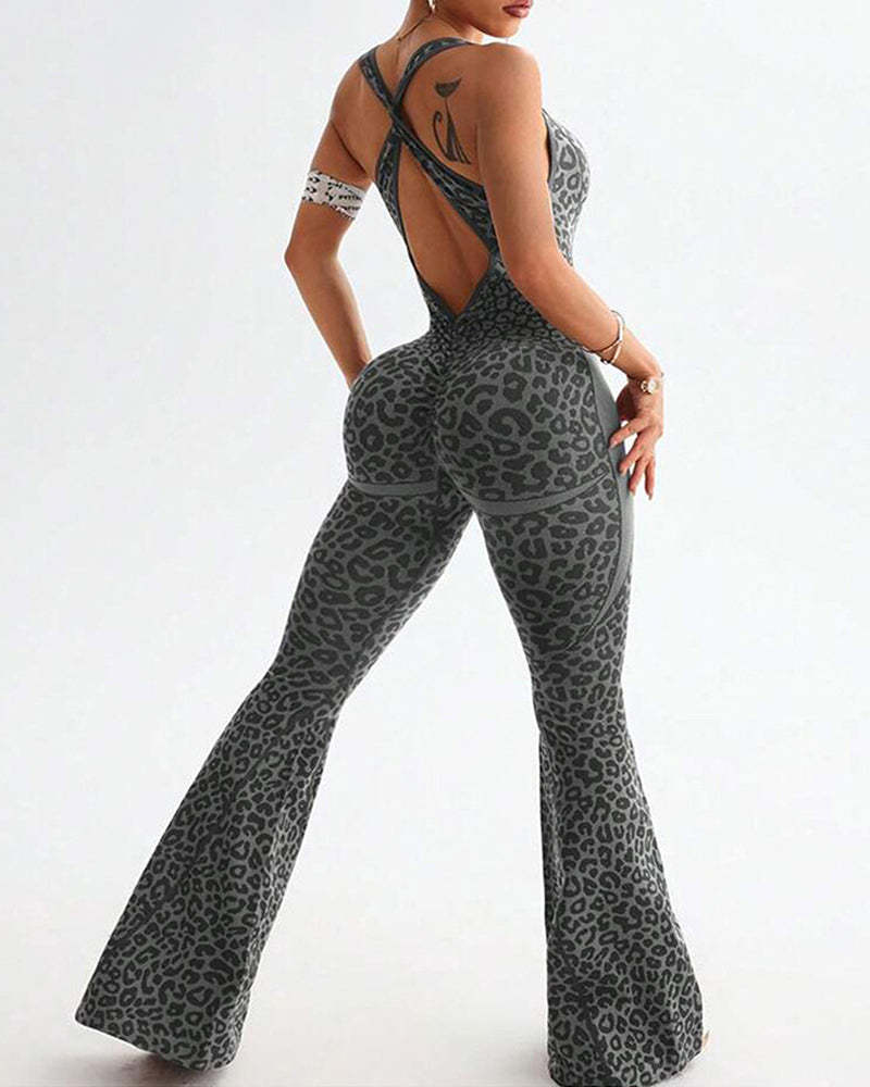 Leopard Print Crossback Seamless Elastic Yoga Fitness Jumpsuit