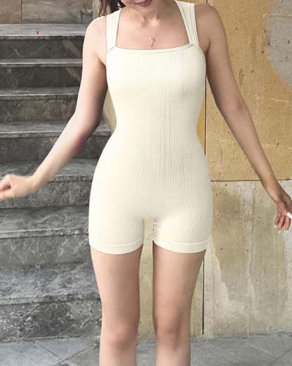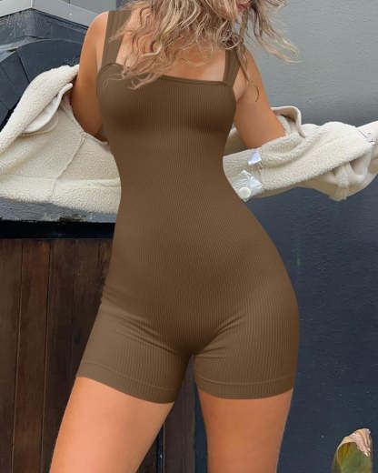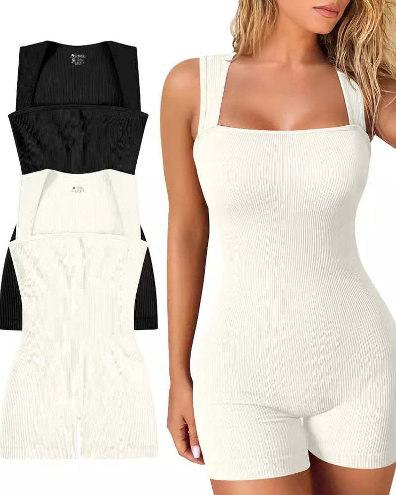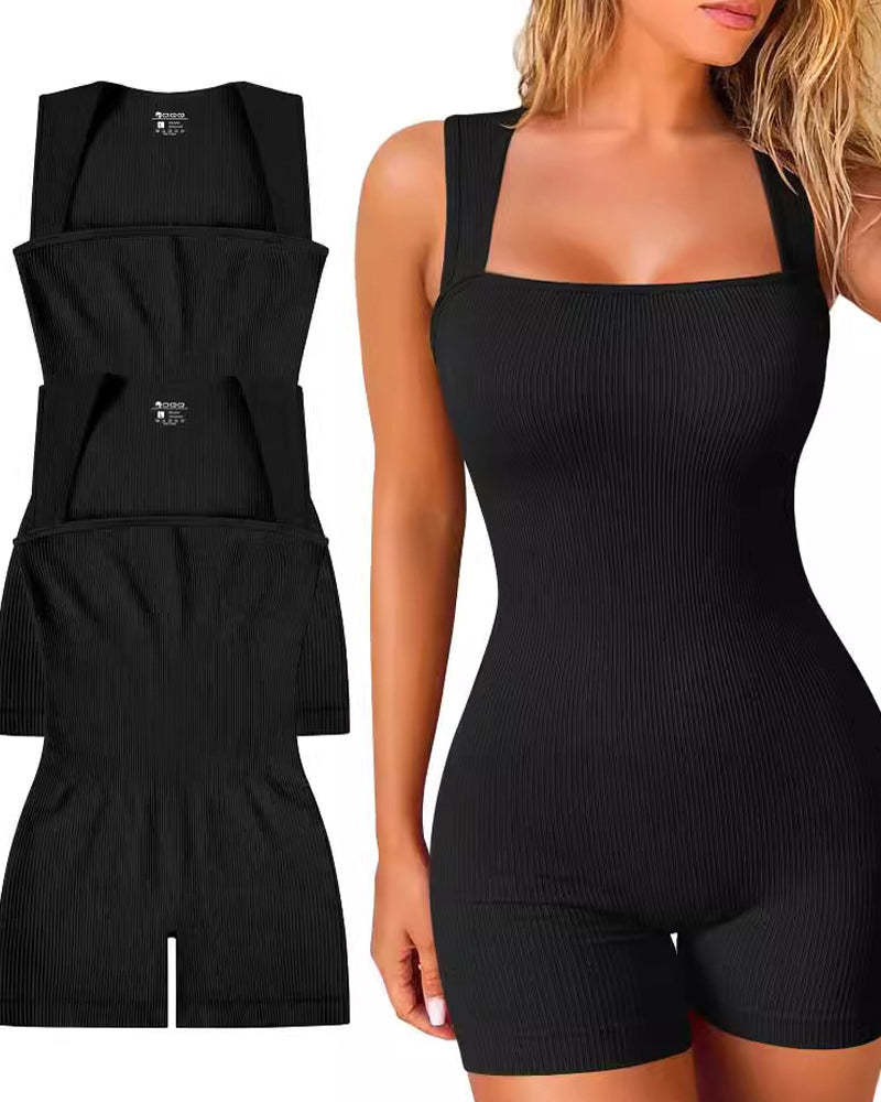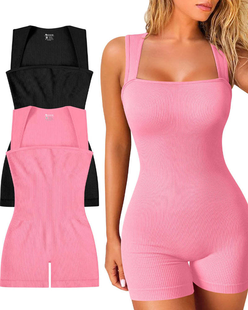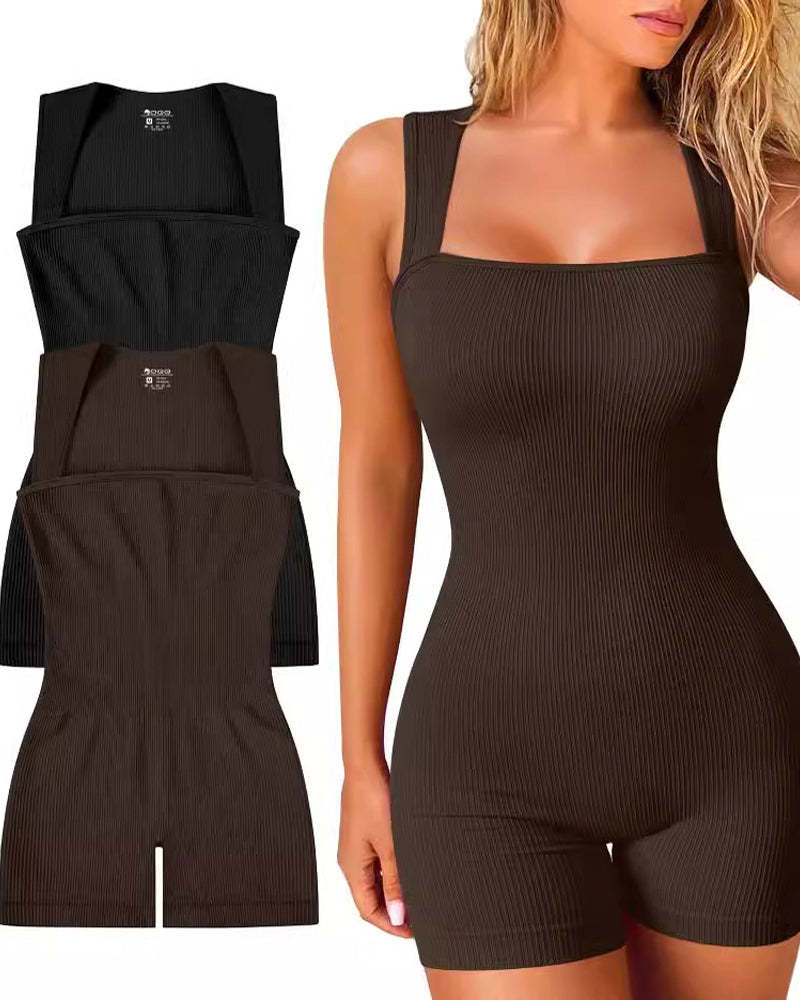 Ribbed Sleeveless Yoga Rompers Tank Tops Square Neck Jumpsuit