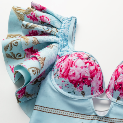 Ruffled Blue Blooming Flowers Print One Piece Swimsuit and Skirt