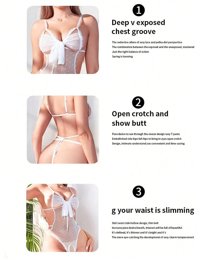 Sexy Floral Lace Bow Tie Open Crotch Hollow Polka Dot Mesh One-Piece Pajamas