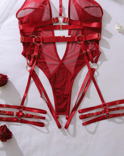 Sexy Holder Backless Metallic Strap See-Through Mesh Bodysuit