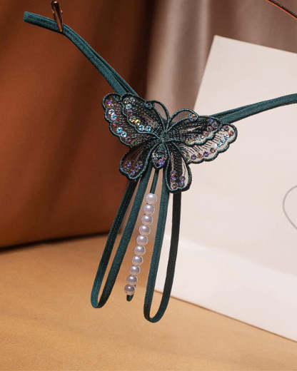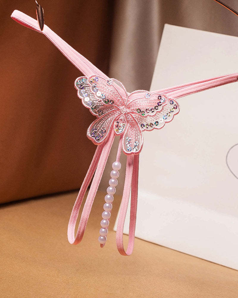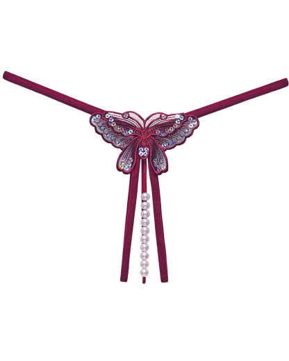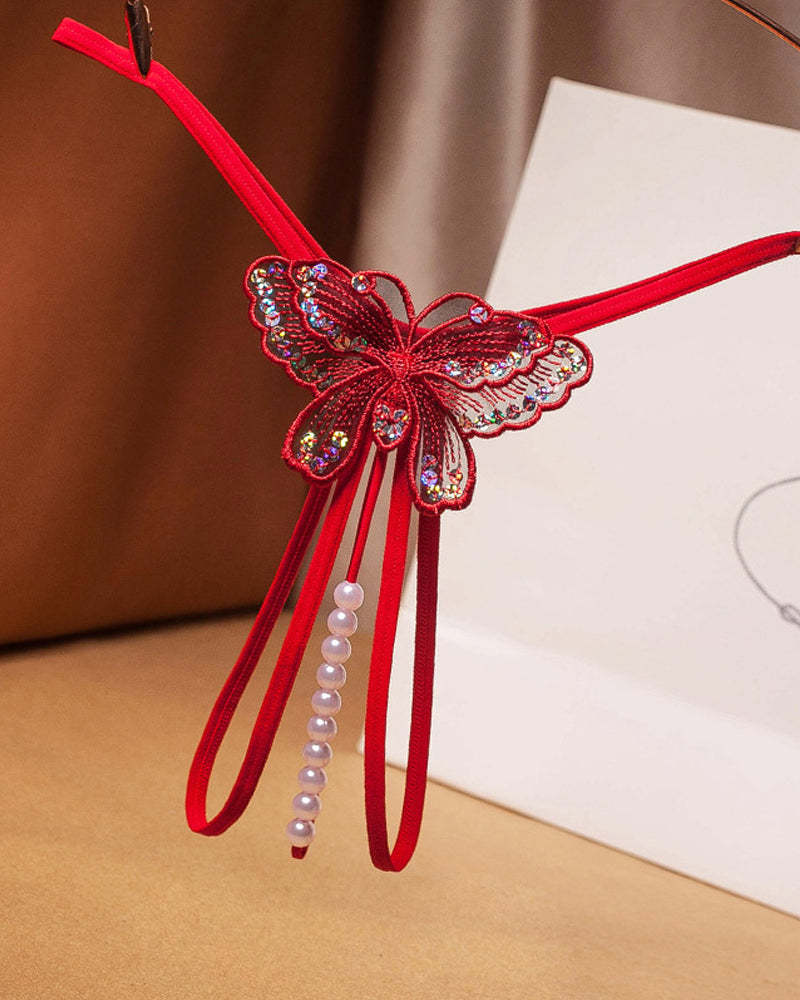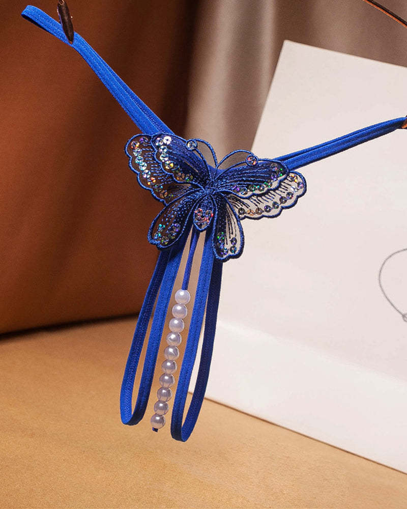 Sexy Sequin Butterfly Embroidered Open Crotch Massage Pearl Thong