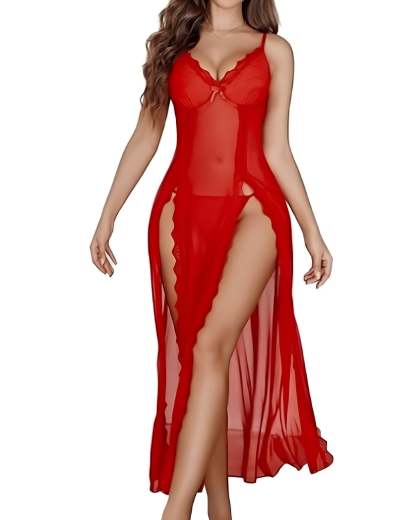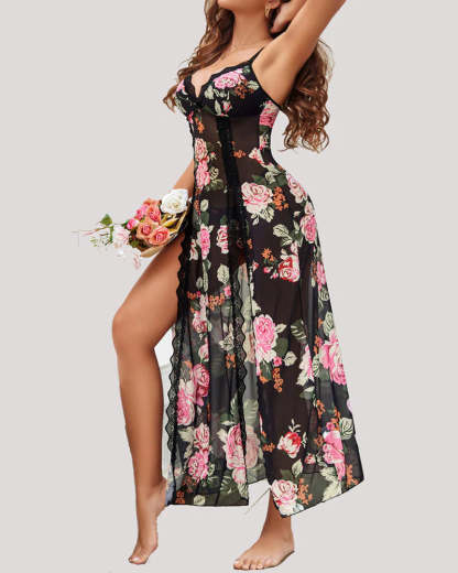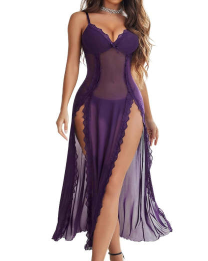 Sexy Suspenders See-Through Lace Mesh Long Slits With Panties Pajamas Set