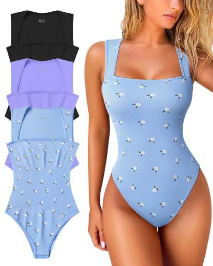 Square Neck Sleeveless Knit Ribbed Seamless Tummy Control Tank Tops Bodysuit