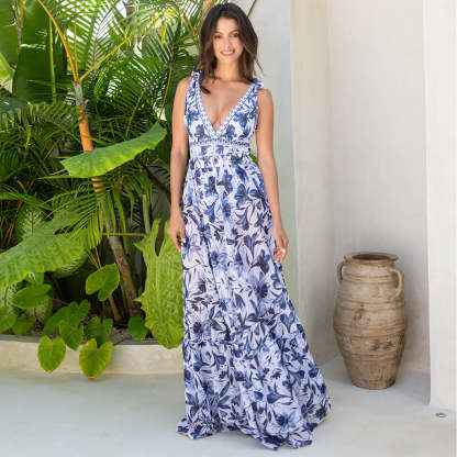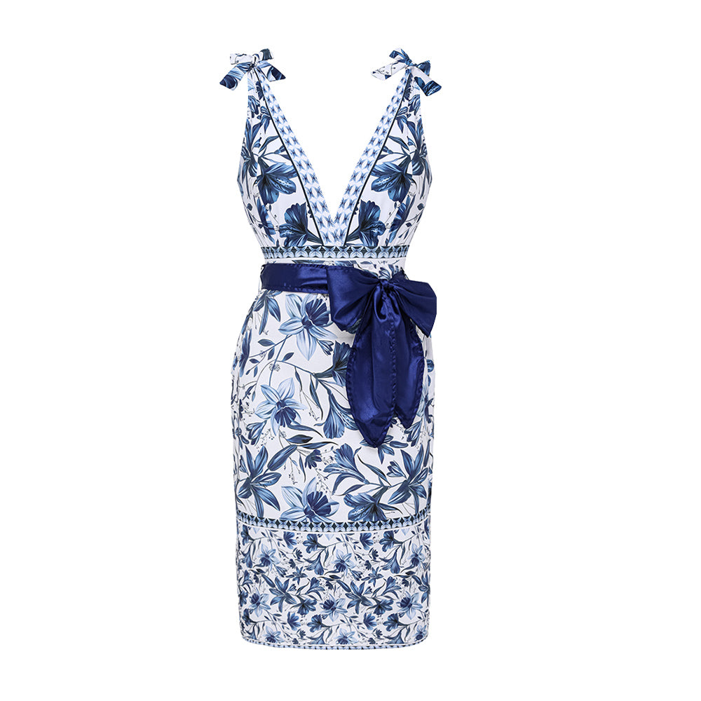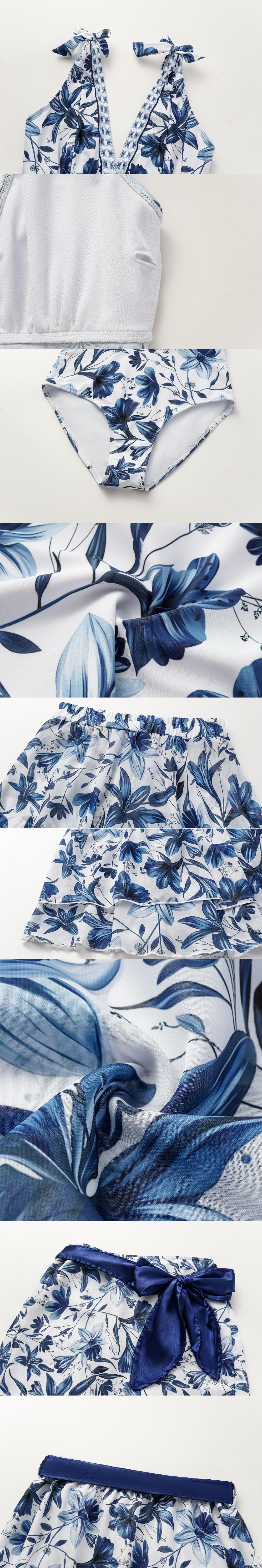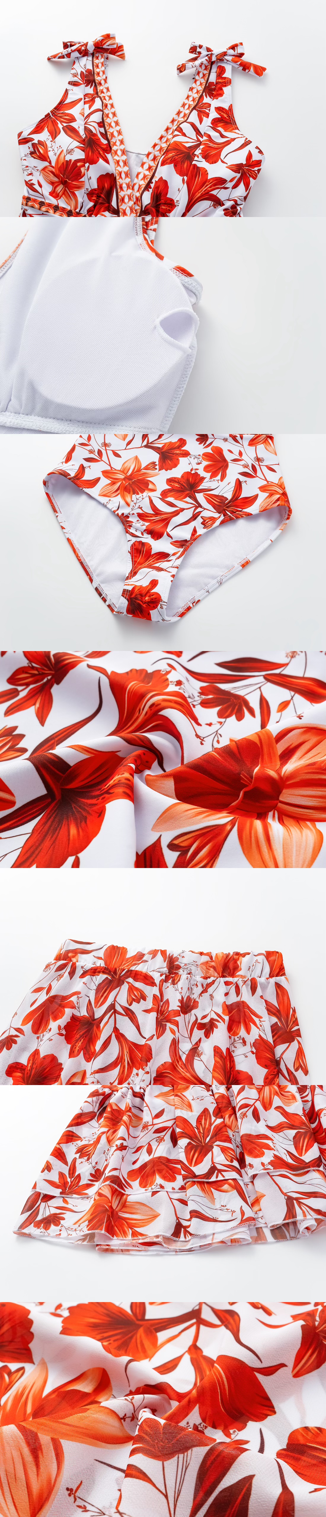 V Neck Lace Up Printed One Piece Swimsuit and Skirt