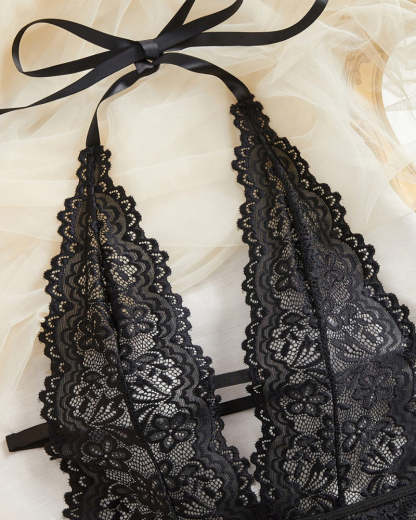 Crafted from premium nylon lace with satin accents